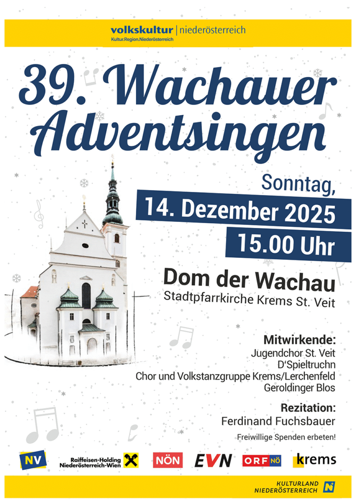 Die Volkskultur Niederösterreich lädt seit fast 40 Jahren zum traditionellen „Wachauer Adventsingen“ in Krems ein. Am Sonntag, 14. Dezember, ab 15.00 Uhr erwartet die Besucherinnen und Besucher wieder ein stimmungsvolles Konzert im „Dom der Wachau“ – Pfarrkirche Krems-St. Veit.
