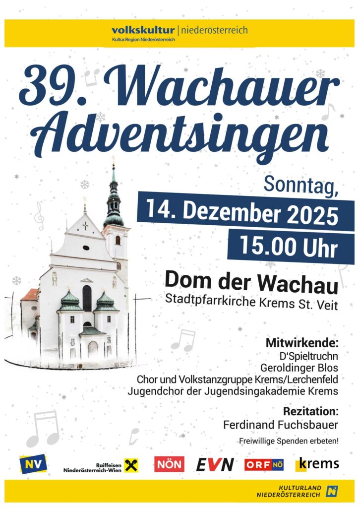 Die Volkskultur Niederösterreich lädt seit fast 40 Jahren zum traditionellen „Wachauer Adventsingen“ in Krems ein. Am Sonntag, 14. Dezember, ab 15.00 Uhr erwartet die Besucherinnen und Besucher wieder ein stimmungsvolles Konzert im „Dom der Wachau“ – Pfarrkirche Krems-St. Veit.